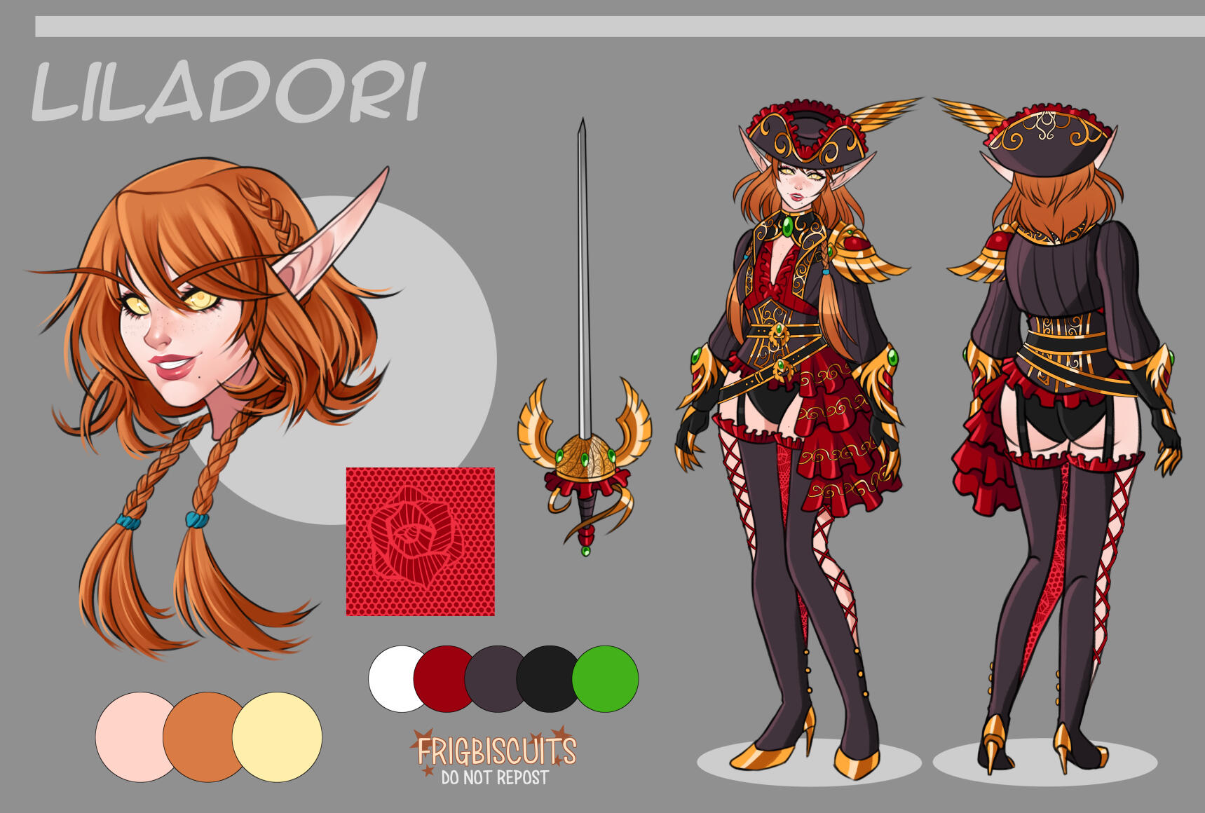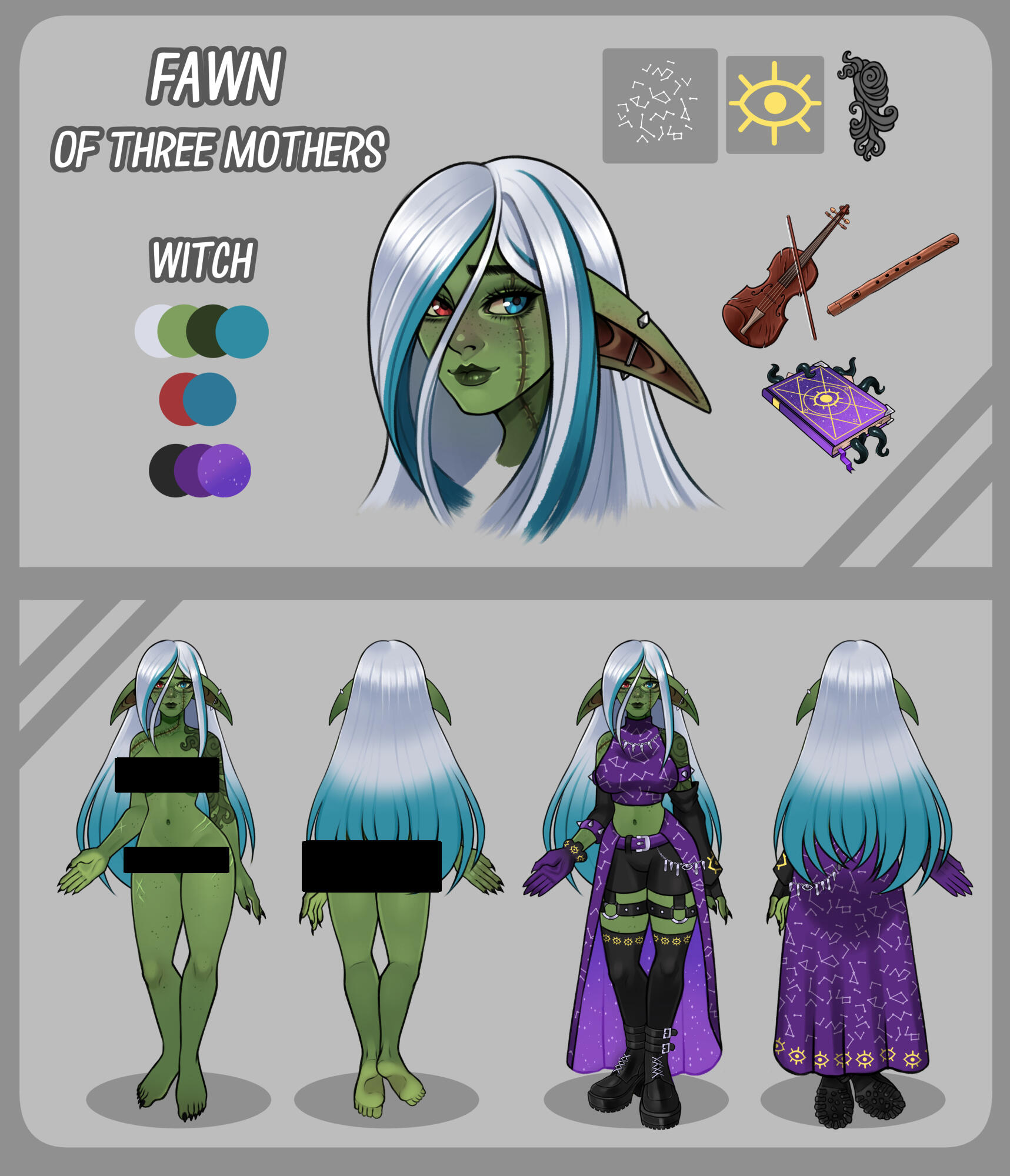 These are hi-resolution character sheets that include a rendered portrait of your character, a front and back view of your character (in underwear, nude, or fully dressed), a basic colour palette, clips of unique details of your character's design (tattoos, markings, specific clothing patterns, etc), and one or more items your character may be carrying (weapons, etc).